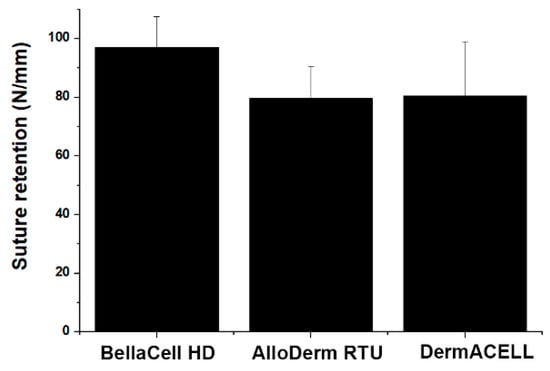 The ADM must withstand tearing at the point of the suture when tension pulls at the suture. Break starting strength is firm against the assessment parameter discrepancies, and it is dependent on the geometry of the sample []. The contrast of suture preservation and mode one crack opening evaluations shows the linear relationship between break starting and tearing energy []. The results of suture retention strength testing showed that the maximum load for BellaCell HD was 97.06 N, which was higher than that for AlloDerm RTU and for DermACELL, as shown in Figure 6. However, these differences were not statistically significant (p > 0.05).