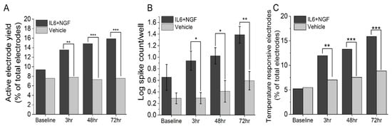 - Black, B.J.; Atmaramani, R.; Kumaraju, R.; Plagens, S.; Romero-Ortega, M.; Dussor, G.; Price, T.J.; Campbell, Z.T.; Pancrazio, J.J. Adult Mouse Sensory Neurons on Microelectrode Arrays Exhibit Increased Spontaneous and Stimulus-Evoked Activity in the Presence of Interleukin-6. J. Neurophysiol. 2018, 120, 1374–1385. [Google Scholar] [CrossRef] [PubMed]