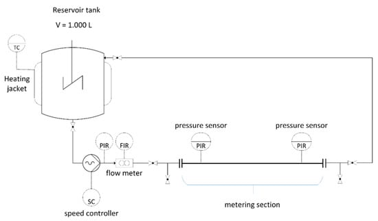 A pipe viscometer (see Figure 2) was developed over the course of the project and used to assess the rheological properties of the digester slurry. The slurry is drawn from one of the digesters and stored in a tempered reservoir tank (V = 1000 L). A progressive cavity pump with a controlled speed is used to convey the slurry into the viscometer, which consists of an inlet zone to obtain the laminar flow and a metering section equipped with two pressure sensors mounted at a distance of 8 m, followed by an outflow zone. Three different pipe diameters (65, 80 and 100 mm) are available in order to adapt the flow behavior to different viscosities. The volume rate is measured by a magneto-inductive flowmeter (PROMAG 55; Endress + Hauser; Switzerland), positioned in the inlet zone. After passing the outlet zone, the medium is transported back to the reservoir tank. A number of ball valves allow the purging of the entire pipeline with fresh material to remove any residues from previous measurements.