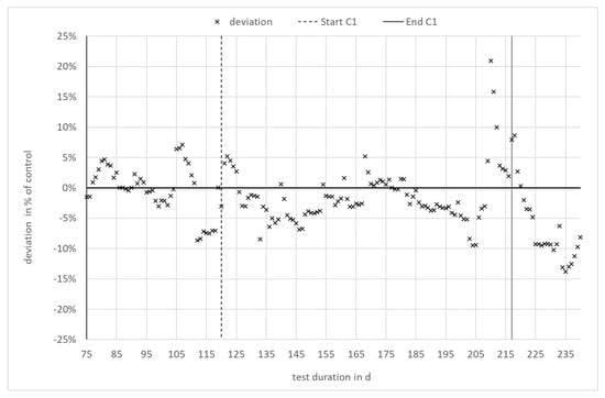 The increase in specific methane yield during the phase of enzyme addition occurred in both digesters to the same extent. It can therefore clearly be attributed to the change in feedstock quality rather than to enzyme application. To enable a comparison of both digesters independent of the specific methane yield of the input, the relative deviation—i.e., the difference between both digesters in relation to the reference, digester 3.2—was calculated. The result is shown in Figure 3. As can be seen, the difference between digester 3.1 with enzyme application and digester 3.2 (reference) is within the range of ±10% over the entire experiment. The relative deviation remains in the same range during the phases with and without enzyme application in digester 3.1. There is no statistically significant trend, as confirmed by a Neumann trend test at a level of significance of 95%.