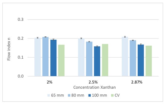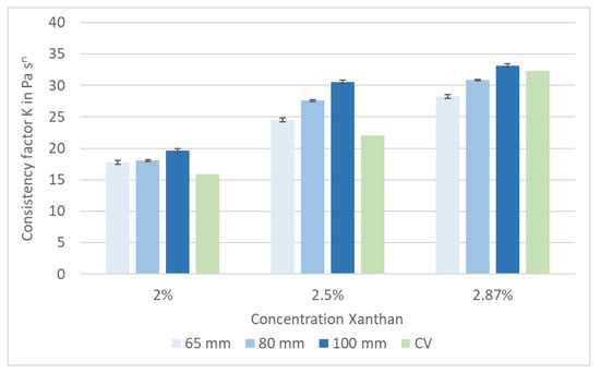 Xanthan was used in three concentrations—200, 250 and 287 g·L−1—to validate and calibrate the pipe viscometer. The flow curves of all three concentrations were measured by the reference capillary viscometer (CV) in duplicate and the pipe viscometer in triplicate. The results for the consistency factor K and flow index n are shown in Figure 4 and Figure 5.