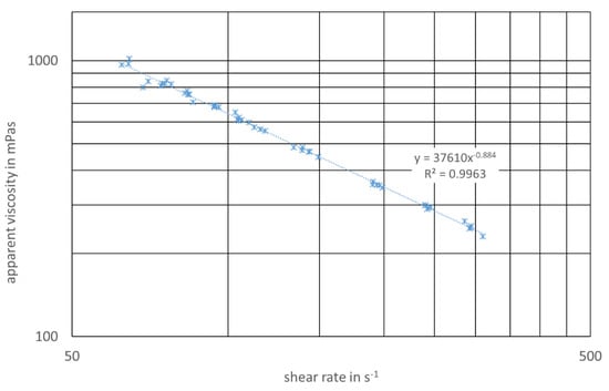 The apparent viscosity was displayed over the shear rate in a flow diagram. The Ostwald–de Baer law as shown in Equation (3) is suitable to describe the shear-thinning behavior [9] and was used to determine the rheological parameters.