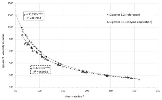 Flow curves of the digester slurry from both digesters (3.1/enzyme application, 3.2/reference) were measured three times after the start of the enzyme application. A typical flow diagram showing the apparent viscosity vs. the shear rate is shown in Figure 6. As can be seen from the regression parameters, the approach shown in Equation (3) delivers a good accordance with the data.