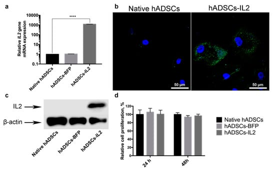 Finally, secretion of tumor necrosis factor α (TNF-α) was increased by 1.5-fold in hADSCs-IL2 (6.8 ± 0.2 pg/mL) compared to native hADSCs (4.7 ± 0.2 pg/mL) and hADSCs-BFP (4.6 ± 0.1 pg/mL) after 72 h of cultivation (Figure 4c).