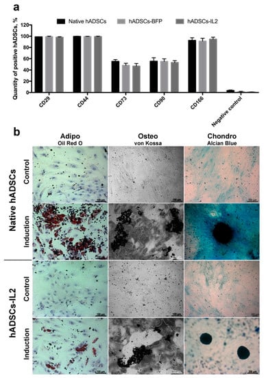 Like native hADSCs, the genetically modified hADSCs-IL2 maintained the ability to differentiate into adipogenic, osteogenic and chondrogenic lineages (Figure 2b). Together, these data indicate that hADSCs-IL2 retain the phenotype of a mesenchymal stem cell, including the differentiation properties of this cell population.