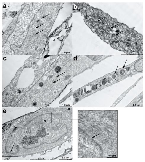Ultrastructure analysis of native hADSCs, hADSCs-BFP (blue fluorescent protein) and hADSCs-IL2 using transmission electron microscopy (TEM). (a) Rough endoplasmic reticulum (ER) of native hADSCs had the form of elongated cisterns with well-distinguishable ribosomes and internal contents of medium electron density (arrows). (b) Rough ER of hADSCs-BFP had high electron density (arrows). (c) Rough ER of hADSCs-IL2 increased in size and had high electron density (arrows). (d) hADSCs-IL2 contain an endosomes (arrows) in the cytoplasm. (e) Nuclear pores in hADSCs-IL2 karyolemma (arrow). N—nucleus. Scale bar: 1–2 μm.