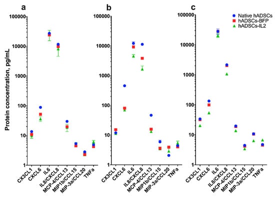 Multiplex analysis of conditioned medium (CM) of native hADSCs, hADSCs-BFP and hADSCs-IL2. CM was harvested from native hADSCs, hADSCs-BFP, hADSCs-IL2 after 24 h of cultivation (a), 48 h of cultivation (b) and 72 h of cultivation (c). Fifty microliters of the sample were used for determining absolute cytokine concentration. Bioplex analysis was performed in two biological replicates, data are shown as the mean percentage ± SD (n = 3).