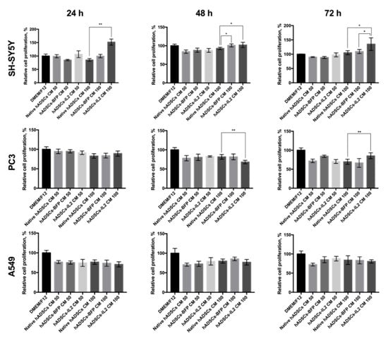 The effect of the CM harvested from native hADSCs, hADSCs-BFP or hADSCs-IL2 on SH-SY5Y (neuroblastoma), PC3 (prostate cancer) and A549 (lung adenocarcinoma) tumor cell proliferation in vitro was investigated. CM was harvested after 24, 48 and 72 h of culture from native hADSCs, hADSCs-BFP or hADSCs-IL2. Cancer cells were plated at a concentration of 5 × 103 cells/100 μL of medium per well in a 96-well culture plate. After 24 h, the medium was replaced with CM from native hADSCs, hADSCs-BFP or hADSCs-IL2 harvested at the 24, 48 or 72 h time points. CM was either applied undiluted (100% CM) or at a 50:50 dilution of CM with DMEM/F12. Cancer cells were grown in CM for 48 h before analysis of their proliferation activity. Growth of SH-SY5Y cells in undiluted (100%) CM obtained from hADSCs-IL2 resulted in the increase in SH-SY5Y proliferation by 65% when using 24-h CM (n = 6, p < 0.01), by 10% with 48-h CM (n = 6, p < 0.05) and 30% with 72-h CM (n = 6, p < 0.05) when compared to SH-SY5Y cells grown in CM obtained from hADSCs and hADSCs-BFP across the same time points (Figure 5). The effect of hADSCs-IL2 CM on PC3 cell proliferation was more variable, showing decreased proliferation of PC3 cells by 13% when exposed to media conditioned by hADSCs-IL2 for 24 h (n = 6, p < 0.01), but an increase in proliferation by 16% (n = 6, p < 0.01) when treated with media conditioned for 72-h, when compared to hADSCs and hADSCs-BFP (Figure 5). CM had no significant effect on A549 proliferative activity regardless of the cells of origin. Interestingly, the proliferation of PC3 and A549 cells was greater when grown in fresh DMEM/F12 alone than when exposed to CM from any hADSC group and/or time point. Only SH-SY5Y cells demonstrated greater proliferation in CM, when media was conditioned by hADSCs-IL2 for 72 h (Figure 5).
