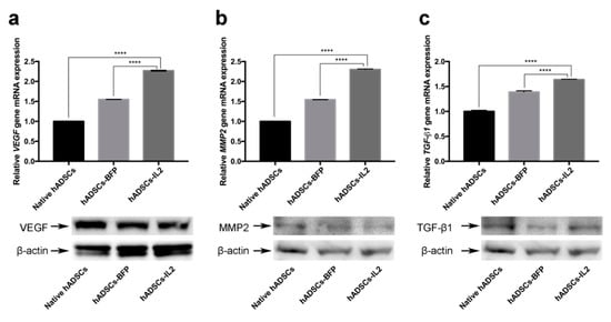 Using quantitative PCR of transcript levels, it was shown that, VEGF gene expression in hADSCs-IL2 was increased 2.3-fold compared to native hADSCs (n = 3, p < 0.0001) and 1.5-fold compared to hADSCs-BFP (n = 3, p < 0.0001) (Figure 6a). Similarly, MMP2 expression was increased 2.3-fold in the hADSCs-IL2 compared to native hADSCs (n = 3, p < 0.0001) and 1.5-fold compared to hADSCs-BFP (n = 3, p < 0.0001) (Figure 6b). Finally, TGF-β1 gene expression was also confirmed to increase in hADSCs-IL2, 1.6 and 1.2-fold compared to native hADSCs and hADSCs-BFP (n = 3, p < 0.0001), respectively (Figure 6c). However, Western blot analysis of VEGF protein expression showed that there was no increase in VEGF protein expression in hADSCs-IL2 compared to hADSCs-BFP or native hADSCs (relative expression of 93%, 96% and 100%, respectively). The relative expression of MMP2 protein was slightly increased (112%) in hADSCs-IL2 compared to hADSCs-BFP (108%) and native hADSCs (100%). A slight increase could also be observed in TGF-β1 protein expression in hADSCs-IL2 (114%) compared to hADSCs-BFP (106%) and native hADSCs (100%) (Figure 6a–c). These data suggest that the over-expressed IL2 impacts the transcription and protein expression of factors that modify the tumor microenvironment, such as MMP2 and TGF-β1. However, as in the case of VEGF changes in transcription are not always seen at the protein level.