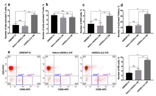 Changes in peripheral blood mononuclear cell (PBMC) activation marker expression after cultivation in hADSCs and hADSCs-IL2 CM. PBMCs were plated in 35 mm non-treated dishes (2 × 106 cells per dish) in 2 mL of CM harvested from hADSCs-IL2, native hADSCs or fresh DMEM/F12. Activation of PBMCs populations was determined using flow cytometry after 72 h. (a) Number of CD3+/HLA-DR+ late-activated T-cells, %. (b) Number of CD3+/CD25+ early-activated T-cells, %. (c) Number of CD3+/CD56+ NKT-cells, %. (d) Number of CD8+/CD38+ activated T-killers, %. (e) Dot-plot with CD3−/CD56+ NK cells cultured in DMEM/F12, hADSC CM, hADSCs-IL2 CM. Each box represents the mean ± SD (n = 3) of two biological replicates. * p < 0.05, ** p < 0.01, ns: no significance.