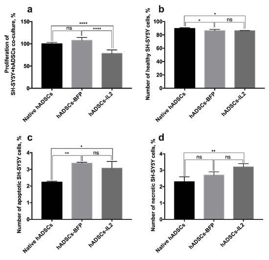 Analysis of SH-SY5Y cell proliferation and viability in co-culture with hADSCs. (a) SH-SY5Y were co-cultured with native hADSCs, hADSCs-BFP and hADSCs-IL2 for 72 h and proliferative activity of co-culture was determined using Cell Proliferation Assay kit (Promega, Madison, WI, USA). Each value is presented as the % in relation to the control (native hADSCs) group. Bars represent the mean ± SD (n = 6) of two biological replicates. (b,c) SH-SY5Y-GFP were co-cultured with native hADSCs, hADSCs-BFP and hADSCs-IL2. After 72 h of co-culture, SH-SY5Y-GFP cells were separated from native hADSCs, hADSCs-BFP or hADSCs-IL2 using FACS Aria III (BD Biosciences, San Jose, CA, USA). The apoptotic and necrotic cell counts were determined immediately after separation by Annexin V/PI staining. Number of healthy (b), apoptotic (c) and necrotic (d) SH-SY5Y cells after co-cultivation with hADSCs represents the mean ± SD (n = 3) of two biological replicates. * p < 0.05, ** p < 0.01, **** p < 0.0001, ns: no significance.