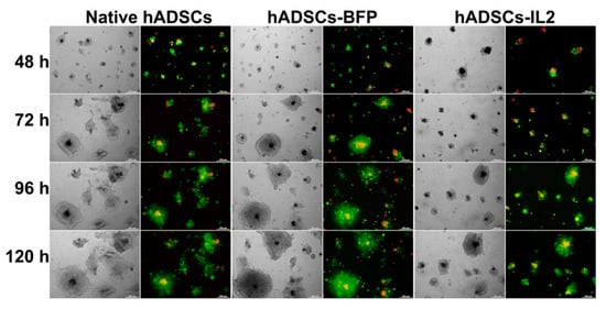 In order to evaluate the organization and interaction of stem and tumor cells, native hADSCs, hADSCs-BFP or hADSCs-IL2 and SH-SY5Y cells were co-cultured on the Matrigel matrix for 120 h. After vital staining of hADSCs with Vybrant DiD dye and SH-SY5Y cells with Vybrant DiO dye, all the cells had red or green fluorescence, respectively, which made it possible to distinguish these cell types in co-culture. An interesting self-organization of hADSCs and SH-SY5Y in co-culture was observed (Figure 9). After 48 h, the cells organized into individual cellular aggregates with flying saucer-like architecture, in which the core consisted of hADSCs that were surrounded by flat aureole of SH-SY5Y cells. Throughout the observation period, SH-SY5Y cells actively proliferated around stem cells, the proliferation rate of tumor cells was significantly higher than the proliferation rate of hADSCs, which led to the compression of hADSC cultures. It is interesting to note that in a co-culture with hADSCs-IL2 the inhibition of SH-SY5Y tumor cell growth was clearly observed compared to co-cultures of SH-SY5Y cells with native hADSCs or hADSCs-BFP (Figure 9).