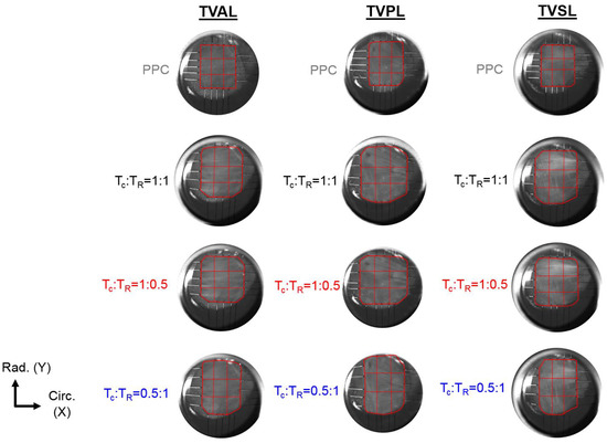 The TVAL specimen displayed minimal changes in from 61.6° in the PPC state to 60.6° and 60.1° under 1:1 and 2:2, respectively. Similar trends were observed for the spatial alignment of the fibers (i.e., DOA), varying from 0.074 in the PPC state to 0.075 under 1:1 and to 0.072 under 2:2. In contrast, the TVPL showed profound changes in , yielding a 30.8% difference from the PPC state (85.9°) to the 1:1 loading protocol (112.4°) and a 29.3% difference when compared to the 2:2 loading state (111.1°). Similarly, the quantified DOA for the PPC state displayed increases of 37.5% and 36.0% compared to 1:1 and 2:2 loading protocols, respectively. For the TVSL, varied from the PPC state (70.9°), by 5.5% for the 1:1 state (67.2°) and 5.8% for the 2:2 state (66.8°), whereas the DOA increased by 40.5% and 37.8% under 1:1 and = 2:2, respectively, when compared to the PPC state.