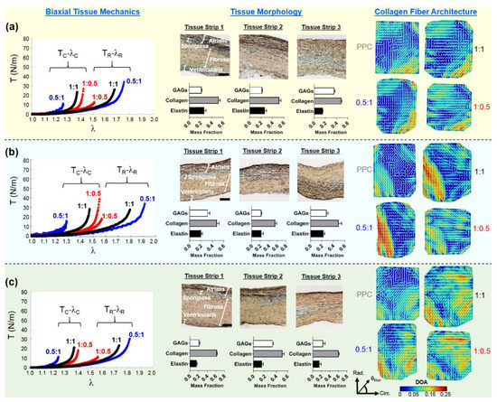 Table 5. Mean, skewness, and standard deviation (SD) for the predicted and the DOA of the entire tissue’s ROI (see right column in Figure 3a–c) for the TVAL, TVPL, and TVSL specimens from heart #1, considering various biaxial tension loading conditions. - Thirdly, the largest percent change in the quantified DOA, as compared to the PPC state, occurred under the radially-dominant loading ( 0.5:1), with a 10.8% increase for the TVAL, a 39.1% increase for the TVPL, and a 47.4% increase for the TVSL, respectively (Table 5). Under circumferentially-dominant loading ( 1:0.5), a minimal change of 1.4% in DOA was seen for the TVAL, with a 27.3% and a 32.4% increase for the TVPL and TVSL, respectively (Table 5).
