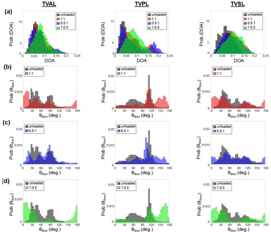 Comparisons of the load-dependent collagen fiber architecture for the entire tissue’s ROI described in Table 1. (see the right column in Figure 3a–c): (a) the predicted DOA, (b) the predicted between unloaded and equibiaxial loading ( 1:1), (c) the predicted between unloaded and radially-dominate loading ( 0.5:1), and (d) the predicted between unloaded and circumferentially-dominated loading ( 1:0.5).