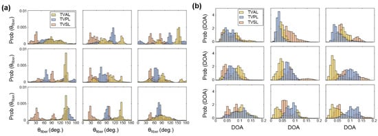 3 × 3 grid comparisons of (a) the predicted , and (b) the predicted DOA in the unloaded state for the TVAL, TVPL, and TVSL specimens from heart #1.