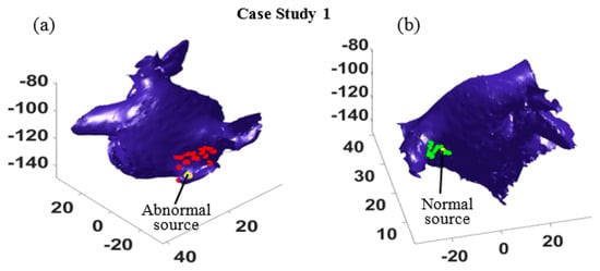Figure 1), and the normal source was set at the intersection between the atrial wall and the Bachmann’s bundle that conducts electrical impulses from the sinoatrial (SA) node to the left atrium (see the yellow dot in