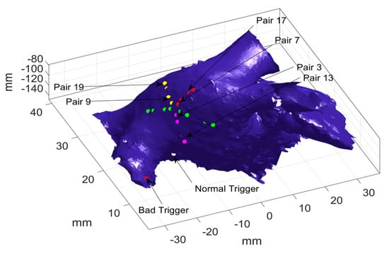 Figure 5, where the yellow dots show the locations of abnormal electrical source and normal source. The estimated source locations from sixteen different catheter locations are marked by green dots for the normal source and by red dots for the focal trigger. As seen in