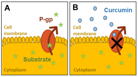Inhibition of P-glycoprotein (P-gp) activity by curcumin: (A) the substrate is pumped out of the cell cytoplasm by P-gp; (B) the activity of P-gp is inhibited by the presence of curcumin molecules on the apical surface.