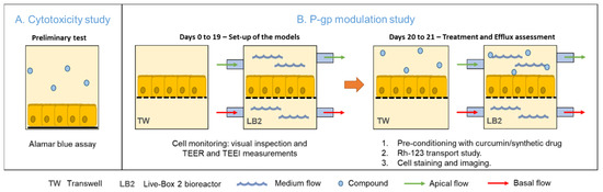 Representation of the experimental approach. (A) Preliminary study on the cytotoxicity of curcumin. (B) Set up of the static and dynamic in vitro models and P-gp activity assessment at the end of the 21-day culture period.