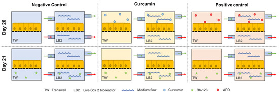 On the twentieth day of culture, all the samples were rinsed with phosphate-buffered saline (PBS) and then incubated with a curcumin solution (50 µg/mL) that was added to the apical compartments through the mixing chambers in the bioreactors (10 mL) and directly in the apical compartment in the Transwells (0.5 mL). The basolateral compartments were filled with fresh medium—10 mL for the bioreactors and 1 mL for the Transwells. The flow rate was set to 150 µL/min in both circuits. All samples were incubated at 37 °C overnight.