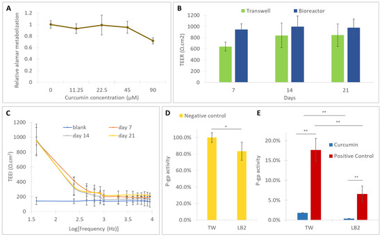 (A) Cell vitality, with respect to the 0 µM control, for different concentrations of curcumin after 48h of incubation; barrier monitoring through (B) trans epithelial electrical resistance (TEER) in the bioreactors and Transwells, (C) trans epithelial electrical impedance (TEEI) in the bioreactors at different timepoints; (D) P-gp activity in untreated samples (negative controls); (E) P-gp activity modulation by curcumin and arylmethyloxy-phenyl derivative (APD) (positive control) in Transwells and in the bioreactors. Error bars represent the standard deviations (n = 6). * = p < 0.05, ** = p < 0.01.