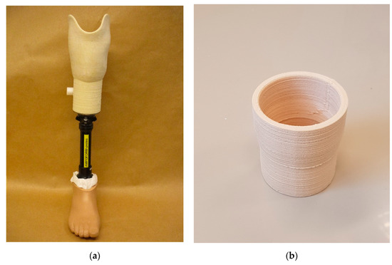 Figure 2a shows a transtibial (lower limb) prosthesis, which was the demonstrator for this work created using the FDM technique with biocomposite materials. To demonstrate AM’s geometric precision, strength, and durability capabilities, a test socket (