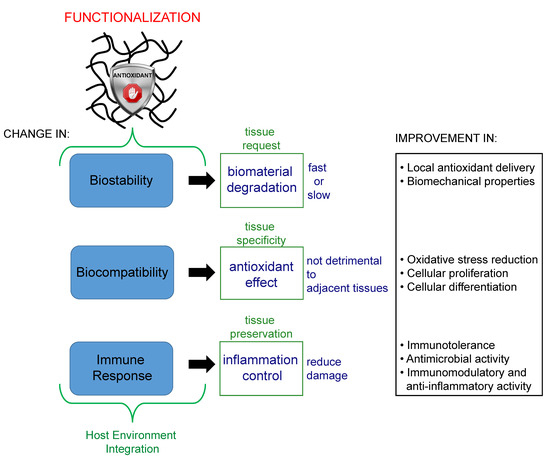 The introduction of the antioxidant into the biomaterial may change its biostability, biocompatibility, and the immune response by the host. In particular, the degradation of the biomaterial, the effect of the antioxidant, and the inflammation control by the functionalized biomaterial are a result of the host tissue integration. The properties should be in accordance with tissue needs.