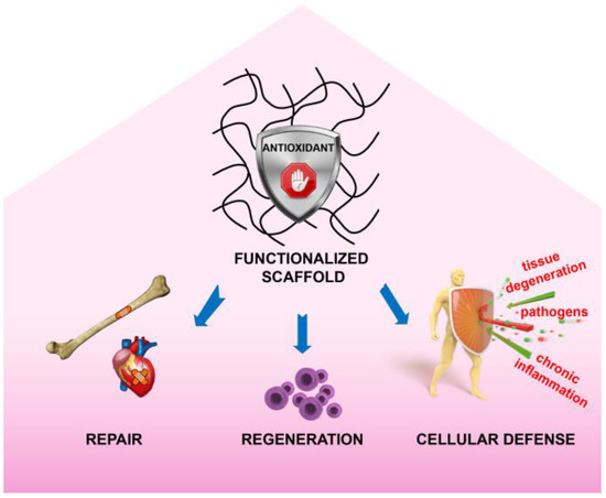 Today, translation of tissue engineering research from the laboratory into the clinic continues to grow at pace, with applications ranging from aesthetic medicine to in situ biomedical sensors. Typically, clinical applications seek to repair or stimulate regeneration of degenerating or aging organs by surgical implantation of biocompatible biomaterials or cell-loaded biomaterials with the appropriate cues, as outlined in the principle of the “tissue engineering triad” [1]. This discipline is considered to hold a critical place in the future of widespread clinical practice, potentially forming a central role in treating an ageing population suffering from cardiovascular [2,3], musculoskeletal, periodontal [4], and diabetic conditions [5,6]. However, although promising in concept, the reality is that, in implementation, implanted tissue engineered constructs face obstacles that extend beyond the triad, with particular exposure to a stressed oxidative environment that can disrupt successful cellular repopulation and tissue regeneration after transplantation [7].
