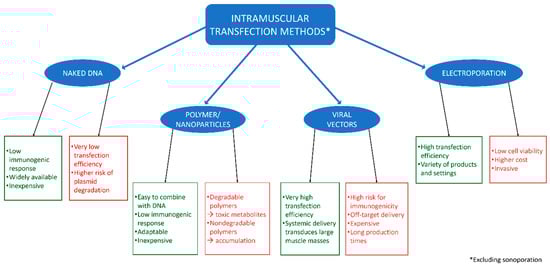 Common approaches for delivery of plasmid DNA into skeletal muscle and their associated advantages (green) and disadvantages (red).