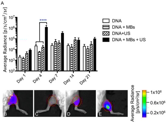 Luciferase 2 (Luc2) expression time course following sonoporation in vivo. (A). Luciferase expression profile in mice treated with microbubble-enhanced sonoporation of Luc2 (an enhanced form of Luciferase) in vivo. Mice were injected once with 50 μg plasmid DNA (DNA and DNA + ultrasound (US) groups), or 50 μg plasmid DNA premixed with 5 × 105 microbubbles (DNA + microbubbles (MBs) and DNA + MBs + US groups) and then treated with an acoustic pressure of 200 kPa for 2 min (DNA + US and DNA + MBs + US group). The treatment effect was monitored using bioluminescence imaging for 21 days after treatment. ****, p < 0.05 relative to control. (B–E). Representative images obtained in each group (DNA, DNA + MBs, DNA + US, and DNA + MBs + US, respectively) on Day 4 with the region of interest indicated by a red oval. Color bar, p/s/cm2/sr. (Reprinted from Shapiro et al. [] with permission.)
