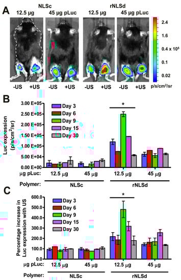 Intramuscular ultrasound-mediated gene delivery or “sonodelivery” in mice by NLSc- and rNLSd-based polyplexes. (A) Representative bioluminescence images of mice transfected with a luciferase reporter plasmid after a 5 min acquisition time using a Xenogen IVIS100 CCD camera (9 days after sonoporation). The right hind legs represent protein expression resulting from intramuscular ultrasound-mediated delivery; the left hind legs represent intramuscular delivery in the absence of ultrasound. The color bar indicates the luminescence intensity in photons per second per square centimeter per steradian (p/s/cm2/sr). (B) Luciferase expression from right hind legs. (C) Percentage change in luciferase expression upon application of an ultrasound stimulus (the ratio of the expression from the right hind leg to that from the left hind leg). Bars indicate ± the standard error of the mean (error bars) with * p < 0.05 for the rNLSd 12.5 μg dose as compared to all other groups. (Reprinted with permission from Parelkar et al. []. Copyright (2014) American Chemical Society.)