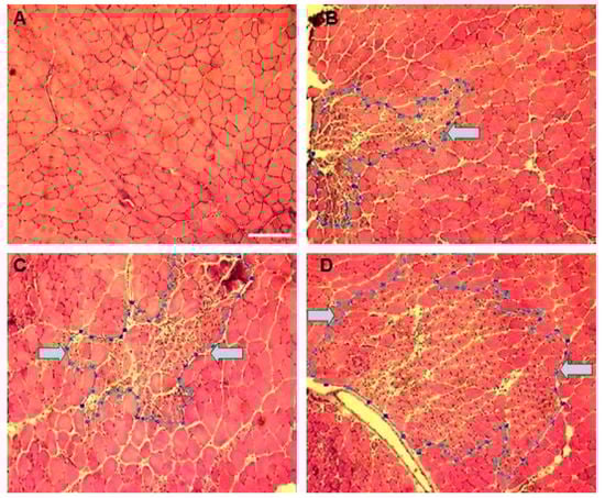 Sizes of the regions of damaged muscles. Both * and ** indicate comparisons between groups and saline control. * indicates p < 0.05 and ** p < 0.01. Data are presented as mean ± s.d. (two-tail Student’s t-test, Microsoft Excel 2003). (Reprinted from Chen et al. [] with permission.)