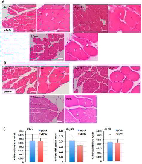 Analysis of muscle damage following gene delivery. Histological analyses at 7 days, 23 days, and 12 months, indicate neither plasmid, pCpGF (A) nor pEPIto (B), produced any significant signs of damage, as shown by H&E staining and visualization of skeletal muscle at 200× magnification. Inset: selected areas at higher magnification to show nuclear positioning in muscle fibers. Scale bar represents 50 μm. Arrows: normal positioning of nuclei at the periphery of muscle fibers, F; arrowheads: occasional atypical nuclei positioned centrally within fibers. (C) Analyses of percentage of muscle fibers displaying atypical central nuclei show no significant differences (p > 0.3) for either plasmid group for all three time points. (Reprinted from Figueiredo Neto et al. [] with permission.)