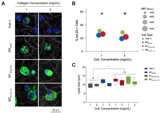 oxLDL uptake by monocytes and macrophages in 3D collagen matrices. (A) Representative confocal images of monocytes and macrophages with DiI-oxLDL uptake. (B) In this infographic, the number of oxLDL+ cells (y-axis) was greatest in THP-1 (grey) followed by M2 (green) macrophages, then M1 (red), and finally M0 (blue). The amount of oxLDL in the cells, as quantified through mean fluorescence intensity (MFI, solid circle) (circle size, see legend), was greatest in M1 macrophages, followed by M0, then M2, and finally THP-1. The dotted circle is the corresponding standard deviation of the MFI. A sample size of 5 was performed for each condition. (C) Lipid droplet size as measured from images obtained with confocal microscopy using a custom-built image analysis toolbox. Data were shown as a boxplot (whiskers represent minimum and maximum, + represents the mean, line inside each box plot represents the median). Significance is represented as * p < 0.05 between samples in 1 mg/mL collagen concentration.