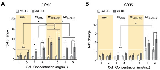 Expression of oxLDL receptors of monocytes and macrophages cultured in 3D collagen matrices. (A) There is an increase in gene expression of lectin-like oxidized low-density lipoprotein receptor-1 (LOX1) in both monocytes (THP-1) and significantly in all macrophage subtypes when cells are cultured in 3D collagen hydrogels and exposed to oxLDL. Significantly, M1+LDL exhibited the highest fold induction and THP-1+LDL, the lowest, with M0+LDL and M2+LDL comparable. LOX1 expression only changed significantly in M1 with collagen concentration (x-axis, 1 mg/mL to 3 mg/mL). (B) Genetic expression of CD36, another oxLDL receptor, was only measurable in M2+LDL, and significantly higher expression was found in lower density collagen hydrogels. All significances represented as p < 0.05, * compared to untreated sample at the same matrix condition, & between oxLDL samples of different cell types at the same matrix condition, and # significant change with collagen concentration. The dotted horizontal line indicates a level of no change.
