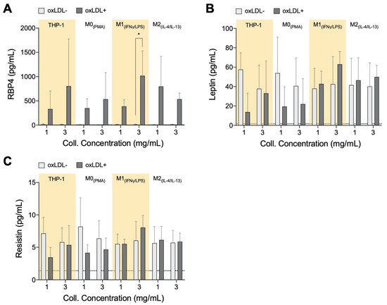 Adipokines retinol-binding protein 4 (RBP4), resistin, and leptin are reported to support the progression of atherosclerosis, while adiponectin has protective actions against plaque formation [54]. These factors are also known to be released along with other pro-inflammatory factors during the development of obesity [55,56,57], and within adipose tissue, they have been shown to induce inflammation by activating macrophages [58]. While no significant statistical differences were found in adipokines, some distinct qualitative trends were observed, which are discussed below. Clinically, RBP4 is a marker for atherosclerotic-associated cardiovascular disease [59]. In animal models, RBP4 has been found to positively contribute towards atherosclerotic progression and mediate LDL uptake [60]. In our model, we found an increase in RPB4 secretion by all cell types in response to oxLDL (Figure 3A); generally, higher secretions were measured in the denser matrix for THP-1+LDL and M1+LDL. It has been demonstrated that RBP4 expression was enhanced in the areas rich in macrophage foam cells in atherosclerotic lesions of aortic specimens from both humans and apolipoprotein E-deficient mice [60], suggesting foam cell-like formation in our biomimetic atherosclerosis models.
