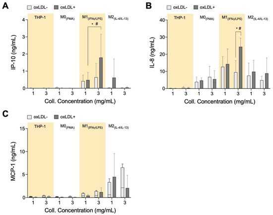 Chemokine secretome from monocytes and macrophages cultured in 3D collagen hydrogels. Box plots of absolute secretion levels of (A) IP-10, (B) IL-8, and (C) MCP-1 to observe trends and indicate comparisons that are statistically significant. The dotted line in box plots marks the lowest detectable concentration of assay. Statistical significance has been determined by two-way ANOVA followed by Tukey’s test, and the level of significance is represented as * p < 0.05 and # p < 0.05 in 3 mg/mL between THP-1+LDL, M0+LDL, and M2+LDL vs. M1+LDL. The dotted horizontal line indicates the lowest detectable limits of the assay.