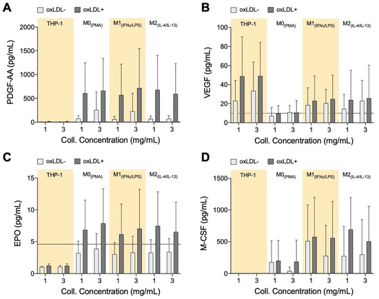 EPO stimulates the mobilization of EPCs from bone marrow, animal models, and patients treated with EPO routinely result in increased EPCs in circulation [85,86]. EPO is postulated to also promote homing and differentiation of EPCs at sites of vascular injury [86]. From our results, EPO levels are consistently elevated with the application of oxLDL on macrophages, regardless of their subtype or the matrix density (Figure 5C). EPO, which may inhibit foam cell formation in mice [87], is secreted equally by all our macrophages, whether it has an inhibiting role in our model will need to be further investigated, but initially it could again imply an auto-regulating function of these cells.