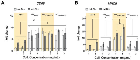 The consensus is that recruited monocytes will get activated in response to oxLDL into pro-inflammatory macrophages during atherosclerosis [1], we, therefore, analyzed gene expression of CD68 and MHCII. CD68 is a pan-macrophage marker and is up-regulated upon macrophage differentiation [90,91,92], while MHCII was found to be a marker for pro-inflammatory macrophages [25]. As expected, without oxLDL, as compared to monocytes, we found higher CD68 expression in all macrophages (Figure 6A). In the presence of oxLDL, we found an up-regulation of CD68 in monocytes, which reaffirms the theory of monocyte differentiation into macrophages by oxLDL. No change in CD68 expression could be observed in macrophages with or without oxLDL. This contradicts reports demonstrating the up-regulation of CD68 upon oxLDL treatment in mouse bone-marrow-derived macrophage [93] and also in THP-1-derived M0 macrophages [94]. The discrepancy in CD68 up-regulation upon oxLDL treatment may arise from cell culture dimensionality. Our 3D matrix density did not have any impact on CD68 expression.