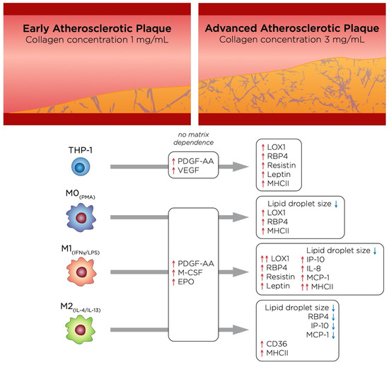 As mentioned previously, there is a necessity to understand the neglected biochemical contributions by monocytes and macrophages to the atherosclerotic microenvironment. Comprehending the adipokine and growth factor contributions by the various immune cell types within the microenvironment could lead to de novo therapeutic strategies against atherosclerosis. We first revealed that adipokines and growth factors are indeed found in our in vitro model for atherosclerosis. THP-1 monocytes and their derived macrophage subtypes exhibited distinct oxLDL uptake, gene expression, and secretome. As oxLDL and lipid size have no significant differences between cells embedded in low or high matrix densities, we can conclude that several of these differential biological readouts are mediated by the density of the collagen hydrogel-based matrices.