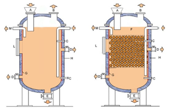 Schematic of the digesters D1 (left) and D2 (right): solid materials input (blocked in the present experimentation) (A), biogas output (B), temperature probe housings (C), sampling points (D), bottom discharge (blocked) (E), fixed bed (F), heating coil (G), insulation (H), sludge input and recirculation ports (I), maintenance openings (L) and digestate output (M).