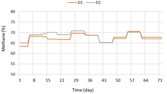 The concentration of methane in biogas resulted in the ranges 63.3–70.5% and 65.0–70.8% for D1 and D2, respectively (Figure 4), results comparable to those from the AD of swine manure [2] and higher than methane concentrations in biogas from bovine manure [3,10]. The literature on the AD of aquaculture effluents reports variable results in terms of methane concentration in biogas: Lanari and Franci [5], for example, reported 80% of CH4 from the AD of trout effluents, while other authors presented values between 48.9 and 57.6% CH4 in biogas from Atlantic salmon effluents [4].