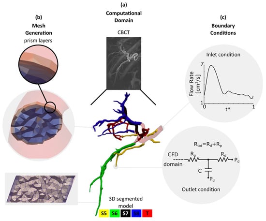 Transarterial embolization is an interventional radiology procedure that has been increasingly used for unresectable liver cancer treatment []. The treatment consists of injecting microspheres loaded with chemotherapeutic agents or radioactive yttrium-90 (90Y) with a catheter through the hepatic artery to target tumors in the liver. Recent studies have shown the potential of computational fluid dynamics (CFD) in tracking the embolization microspheres [,,]. Simulation of the blood flow behavior inside the hepatic arterial tree can help predict the microsphere trajectories and thus their distribution between different liver segments. Using these predictions, the injection location and volume can be optimized before the treatment to maximize the tumor targeting. The CFD simulation results are however affected by different factors that need to be carefully studied. Among these parameters, the boundary conditions imposed on the computational domain play an important role []. Although the effect of boundary conditions on the lower-dimensional models (e.g., 0D and 1D model) of the hepatic artery has been discussed in the literature [,], it has not been quantitatively investigated for 3D CFD simulation of the hepatic arterial tree hemodynamics. Three-dimensional CFD simulation provides fine details of the flow internally within the 3D domain. Thus, it can show how boundary condition variations change the local field parameters such as velocity field and flow streamlines inside the hepatic arterial tree.