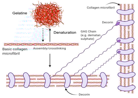 The structural forms of collagen and their native interactions. The basic collagen unit is a triple-helix microfiber that denatures into gelatine or can be assembled into collagen fibrils. Decorin proteins wrap around collagen fibrils in their native context and bind with glycosaminoglycan chains such as dermatan sulphate. Created with BioRender.com.