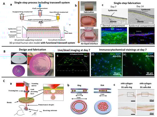 Bioprinting of collagen-based inks for tissue engineering. (A) (a,b) Hybrid system (extrusion-based and inkjet-based dispensing modules) used for bioprinting of collagen bioink for developing human skin models, (c) bioprinted model showed good structural features and respective dermis (Col) and epidermis (K10) biomarkers []; (B) (a,b) Drop-on-demand (DoD) bioprinting was used for bioprinting collagen bioink to develop functional biomimetic 3D corneal model, (c) 3D view of human CSK 7 days after bioprinting stained with live/dead staining, most of cells found viable, (d) Smooth muscle actin immunocytochemical stainings of CSK-loaded agarose-collagen blends 7 days after bioprinting, observed positive keratocan (Kera) and lumican (Lum) expression []; (C) (a) Laser-assisted bioprinting was explored for in-situ bioprinting of collagen-based bioinks for bone regeneration applications, (b) two different printed designs: a ring and a disk, and (c) disk printed geometry showed homogeneous regeneration throughout the defect, in contrast with the ring geometry, where regeneration is mainly observed at the periphery [].