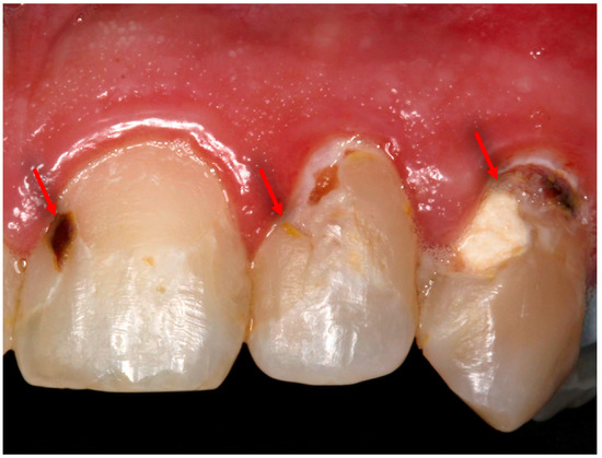 Clinical aspect of several secondary carious lesions around resin composite restorations in the anterior teeth. The arrows in the photo showing the location of the lesions at the tooth/restoration interface presented by yellow and brownish to black discoloration.