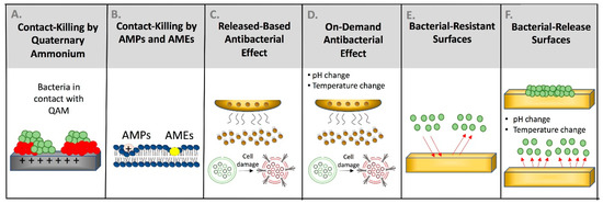 Antibacterial killing strategies can be achieved via different approaches. The contact-killing mechanism can be provided by quaternary ammonium compounds posing highly positive charged surfaces to disrupt accumulated microorganisms (A). Antimicrobial peptides (AMPs) and antimicrobial enzymes (AMEs) can conduct contact-killing by invading the cellular membrane and targeting the main cellular components (B). Antimicrobial peptides can also conduct antibacterial action via its positively-charged surface. The antibacterial action via ion release can be provided by release-based (C) and on-demand (D) antibacterial materials. Materials interfering with bacterial adhesion can be designed using bacterial-resistance and bacterial-release surfaces (E,F).