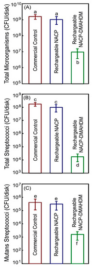 Colony-forming units were grown over the resin composite surfaces using saliva-derived biofilm: (A) total microorganisms; (B) total Streptococci; and (C) Mutans streptococci. Adapted from Reference [65], with permission from © 2020 Elsevier.