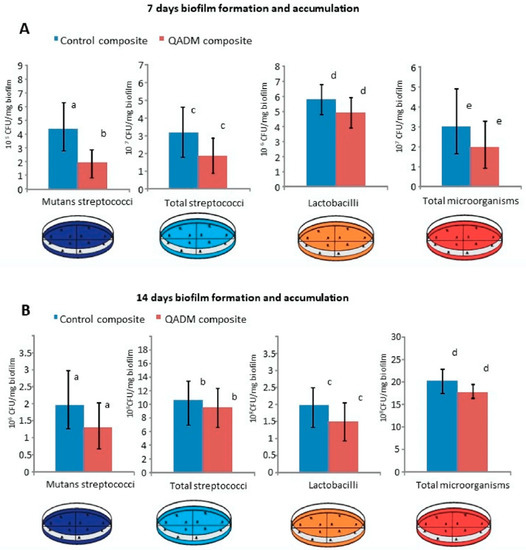 Resin composites containing quaternary ammonium monomers were associated with lower, but not significant, biofilm growth of total microorganisms, total Streptococci, Mutans streptococci, and total Lactobacilli after 7 (A) and 14 (B) days of biofilm formation in situ. Adapted from Reference [68], with permission Melo et al., 2018.
